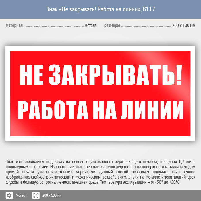 Знак «Не закрывать! Работа на линии», B117 (металл, 200х100 мм) в Кашире купить