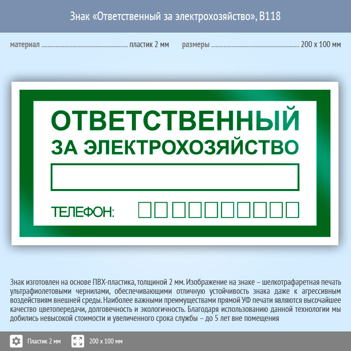 Знак «Ответственный за электрохозяйство», B118 (пластик, 200х100 мм) в Кашире купить