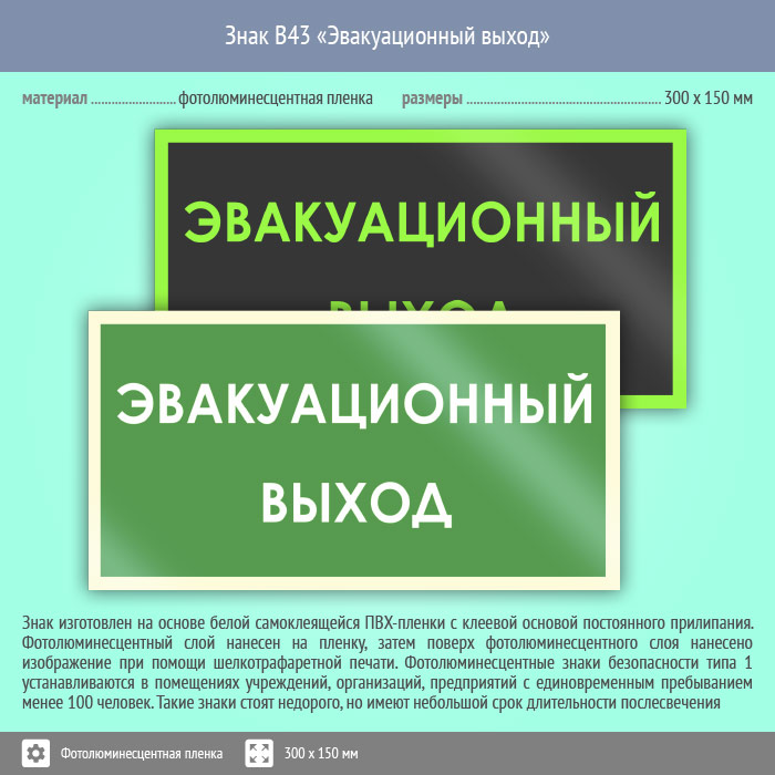 Знак B43 «Эвакуационный выход» (фотолюминесцентная пленка, 300х150 мм) в Кашире купить