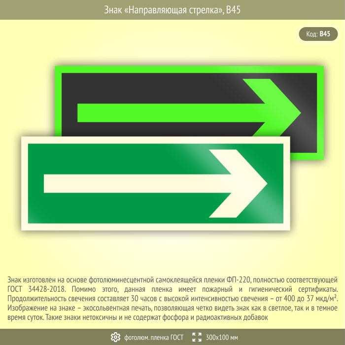 Знак «Направляющая стрелка», B45 (фотолюминесцентная пленка ГОСТ 34428-2018, 300х100 мм) в Кашире купить