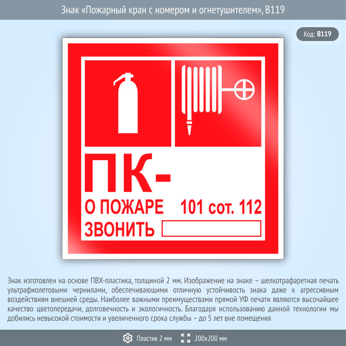 Знак «Пожарный кран с номером и огнетушителем», B119 (пластик, 200х200 мм) в Кашире купить