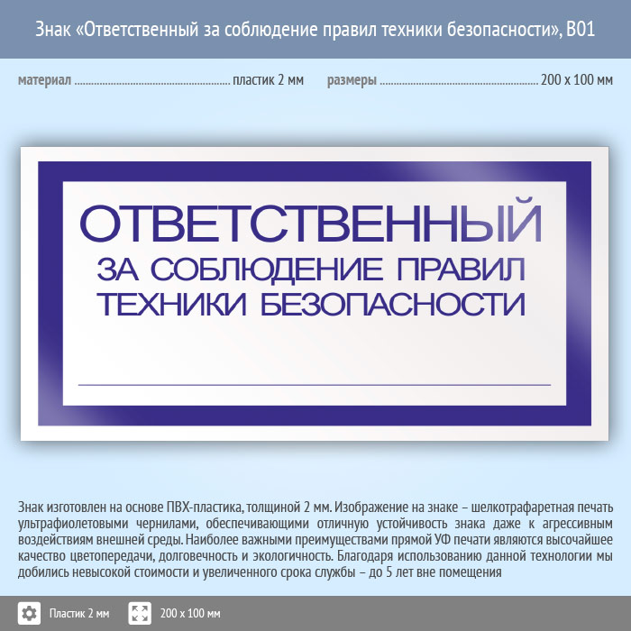 Знак «Ответственный за соблюдение правил техники безопасности», B01 (пластик, 200х100 мм) в Кашире купить