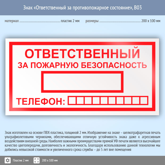 Знак «Ответственный за пожарную безопасность», B03 (пластик, 200х100 мм) в Кашире купить