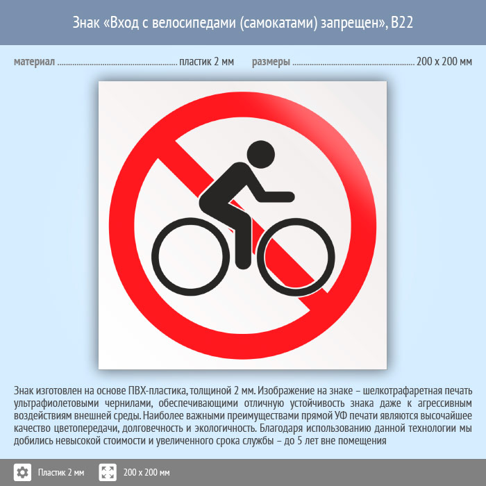 Знак «Вход с велосипедами (самокатами) запрещен», B22 (пластик, 200х200 мм) в Кашире купить