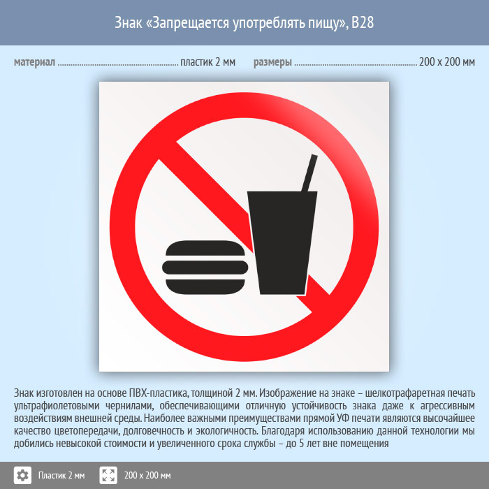 Знак «Запрещается употреблять пищу», B28 (пластик, 200х200 мм) в Кашире купить