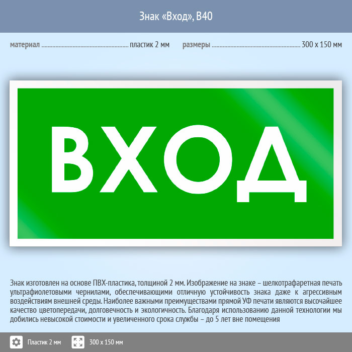 Знак «Вход», B40 (пластик, 300х150 мм) в Кашире купить