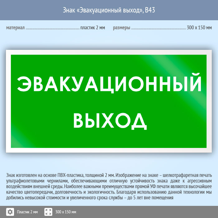 Знак «Эвакуационный выход», B43 (пластик, 300х150 мм) в Кашире купить