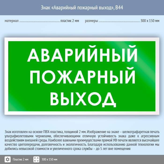 Знак «Аварийный пожарный выход», B44 (пластик, 300х150 мм) в Кашире купить