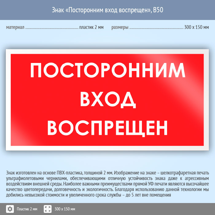 Знак «Посторонним вход воспрещен», B50 (пластик, 300х150 мм) в Кашире купить