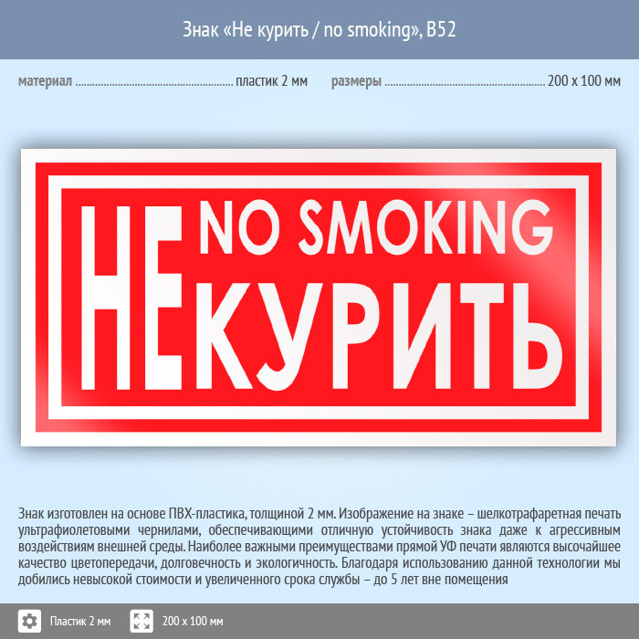Знак «Не курить / no smoking», B52 (пластик, 200х100 мм) в Кашире купить