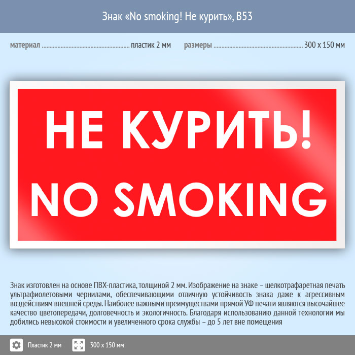 Знак «No smoking! Не курить», B53 (пластик, 300х150 мм) в Кашире купить