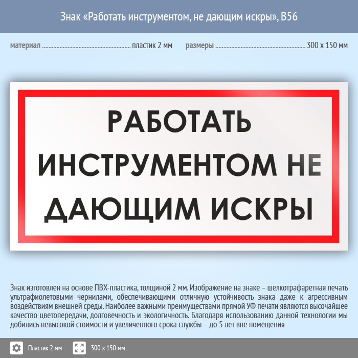 Знак «Работать инструментом, не дающим искры», B56 (пластик, 300х150 мм) в Кашире купить
