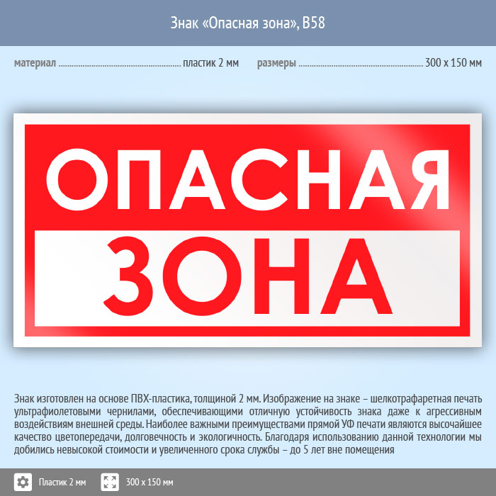 Знак «Опасная зона», B58 (пластик, 300х150 мм) в Кашире купить