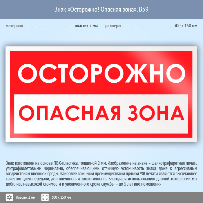 Знак «Осторожно! Опасная зона», B59 (пластик, 300х150 мм) в Кашире купить