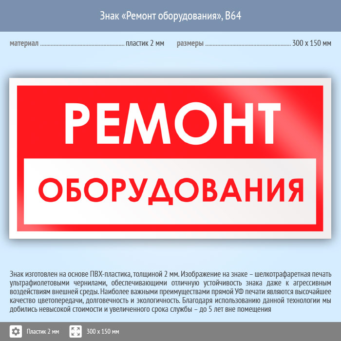 Знак «Ремонт оборудования», B64 (пластик, 300х150 мм) в Кашире купить