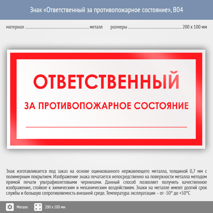 Знак «Ответственный за противопожарное состояние», B04 (металл, 200х100 мм) в Кашире купить