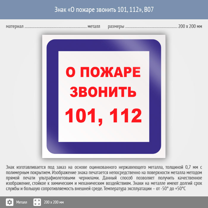 Знак «О пожаре звонить 101, 112», B07 (металл, 200х200 мм) в Кашире купить