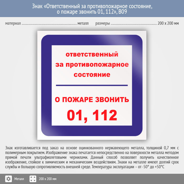 Знак «Ответственный за противопожарное состояние, о пожаре звонить 01, 112», B09 (металл, 200х200 мм) в Кашире купить