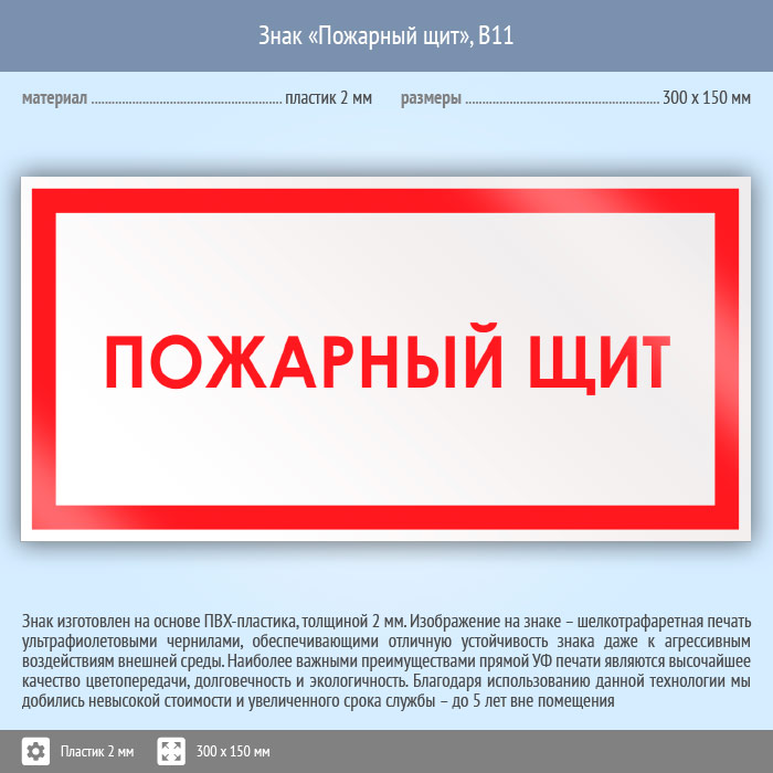 Знак «Пожарный щит», B11 (пластик, 300х150 мм) в Кашире купить