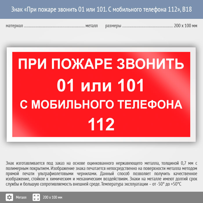Знак «При пожаре звонить 01 или 101. С мобильного телефона 112», B18 (металл, 200х100 мм) в Кашире купить