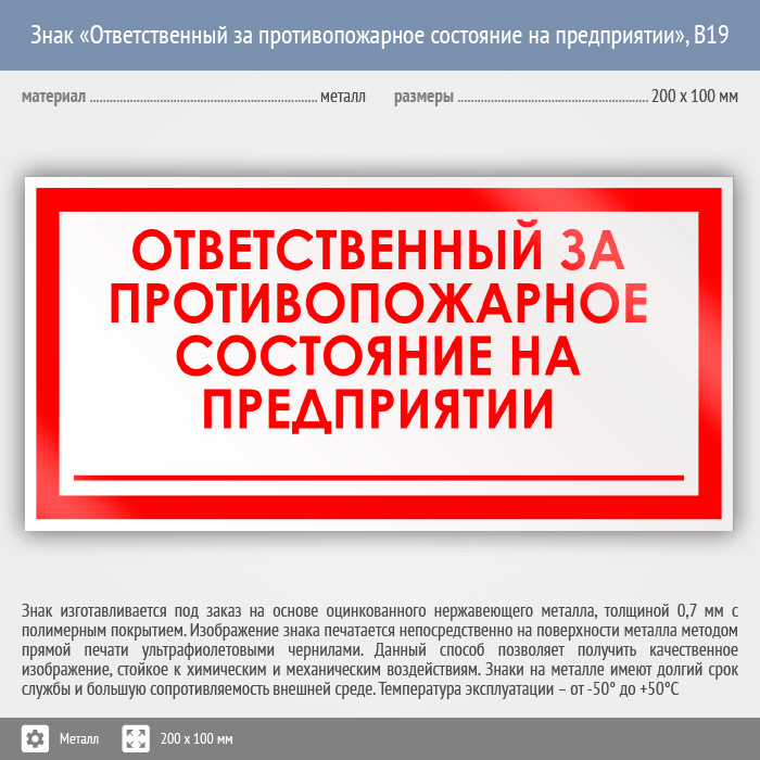 Знак «Ответственный за противопожарное состояние на предприятии», B19 (металл, 200х100 мм) в Кашире купить