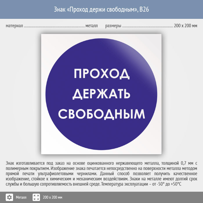 Знак «Проход держи свободным», B26 (металл, 200х200 мм) в Кашире купить