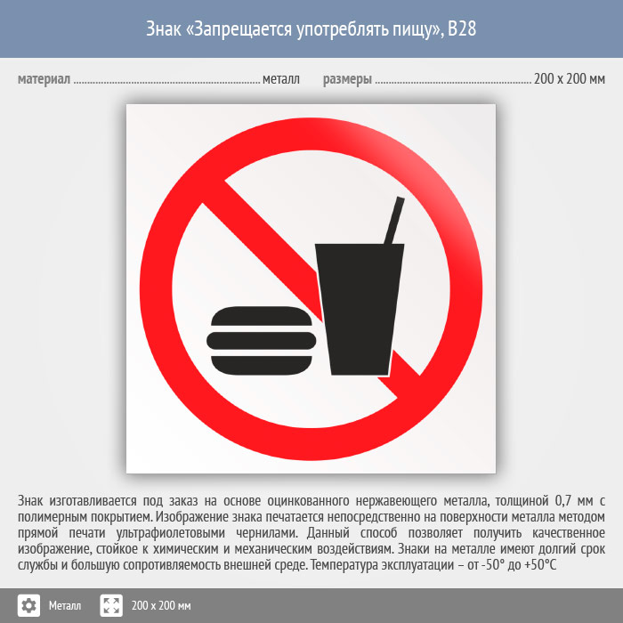 Знак «Запрещается употреблять пищу», B28 (металл, 200х200 мм) в Кашире купить