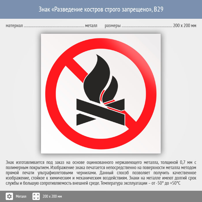 Знак «Разведение костров строго запрещено», B29 (металл, 200х200 мм) в Кашире купить