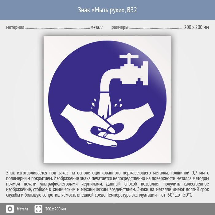 Знак «Мыть руки», B32 (металл, 200х200 мм) в Кашире купить