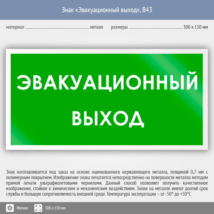 Знак «Эвакуационный выход», B43 (металл, 300х150 мм) в Кашире купить