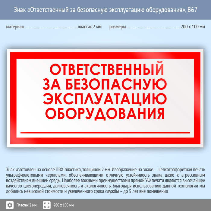 Знак «Ответственный за безопасную эксплуатацию оборудования», B67 (пластик, 200х100 мм) в Кашире купить