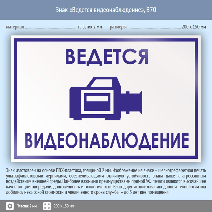 Знак «Ведется видеонаблюдение», B70 (пластик, 200х150 мм) в Кашире купить