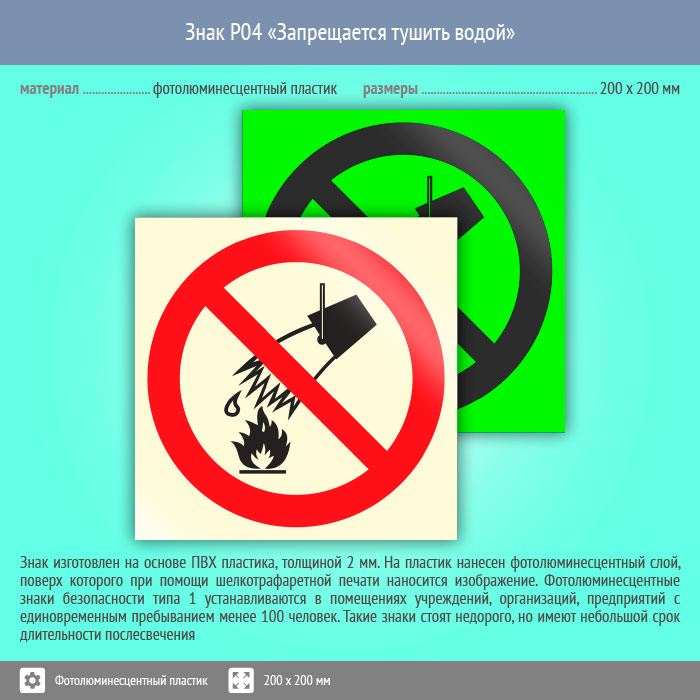 Знак P04 «Запрещается тушить водой» (фотолюминесцентный пластик, 200х200 мм) в Кашире купить