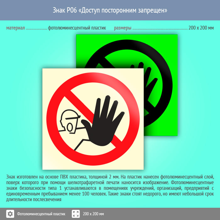 Знак P06 «Доступ посторонним запрещен» (фотолюминесцентный пластик, 200х200 мм) в Кашире купить