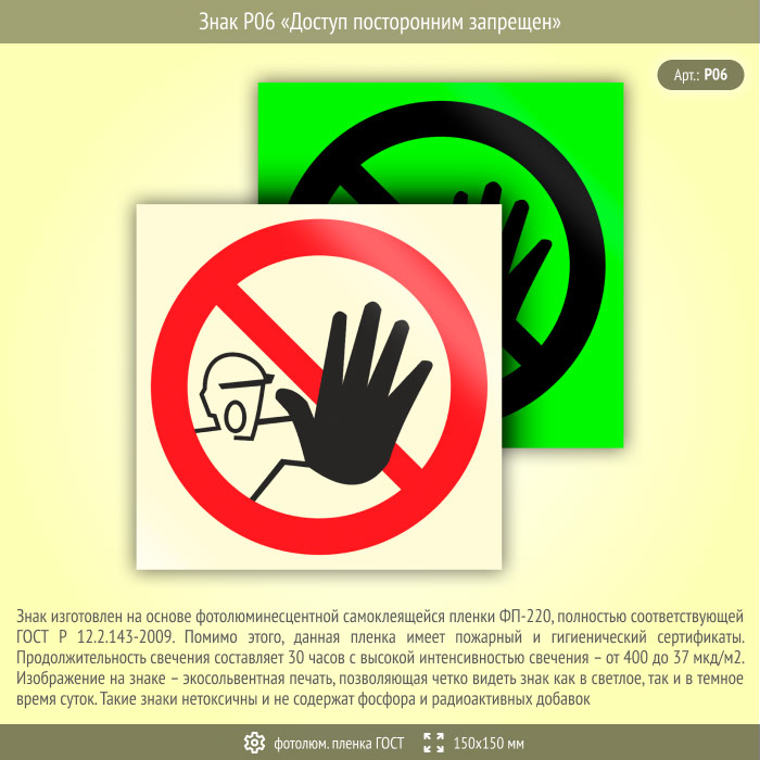 Знак P06 «Доступ посторонним запрещен» (фотолюминесцентная пленка ГОСТ 34428-2018, 150х150 мм) в Кашире купить