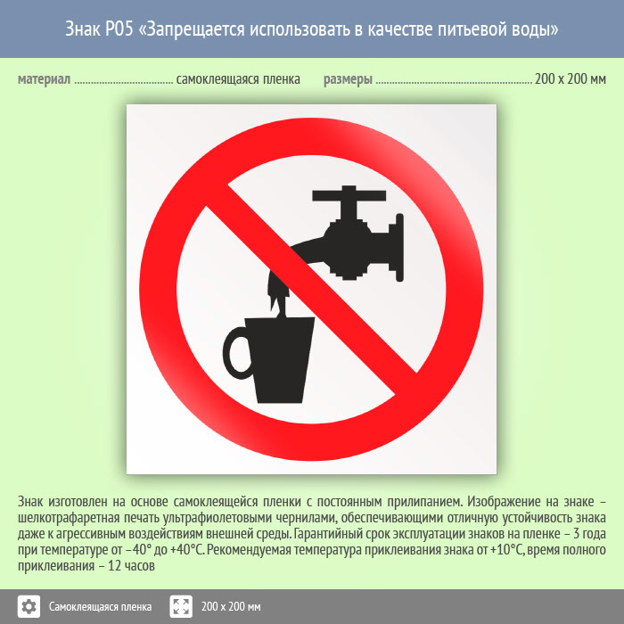 Знак P05 «Запрещается использовать в качестве питьевой воды» (пленка, 200х200 мм) в Кашире купить