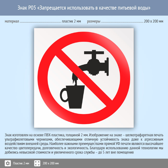 Знак P05 «Запрещается использовать в качестве питьевой воды» (пластик, 200х200 мм) в Кашире купить