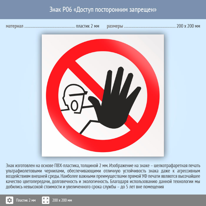 Знак P06 «Доступ посторонним запрещен» (пластик, 200х200 мм) в Кашире купить