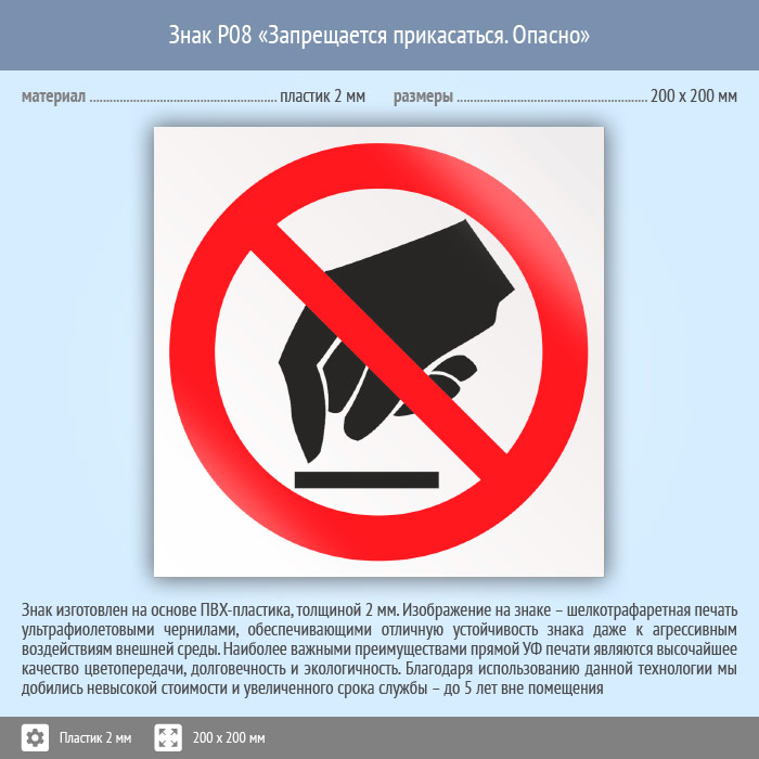 Знак P08 «Запрещается прикасаться. Опасно» (пластик, 200х200 мм) в Кашире купить