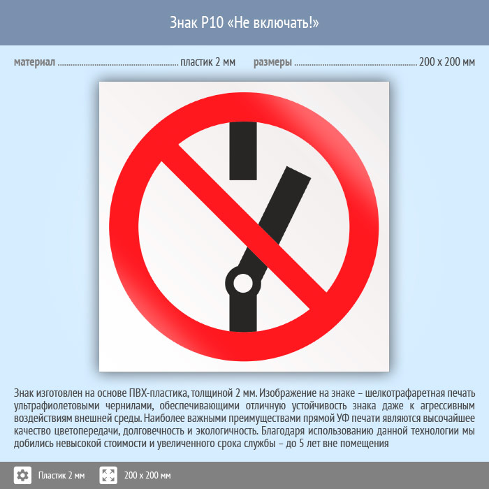 Знак P10 «Не включать!» (пластик, 200х200 мм) в Кашире купить