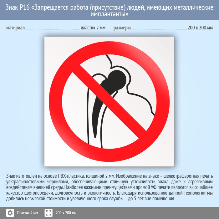 Знак P16 «Запрещается работа (присутствие) людей, имеющих металлические имплантанты» (пластик, 200х200 мм) в Кашире купить