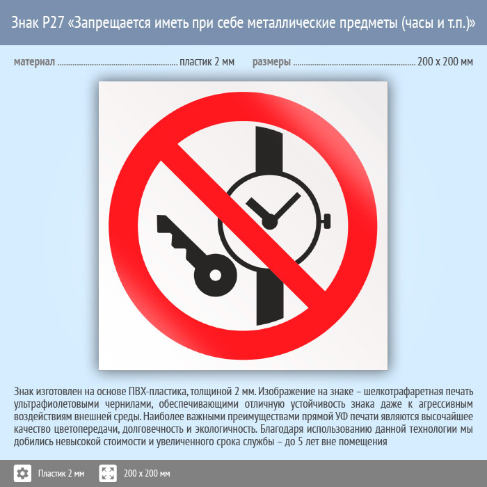 Знак P27 «Запрещается иметь при (на) себе металлические предметы (часы и т.п.)» (пластик, 200х200 мм) в Кашире купить