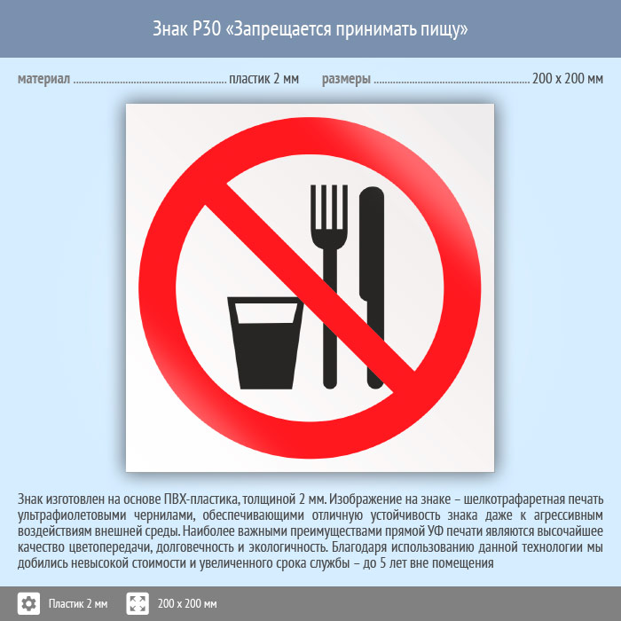 Знак P30 «Запрещается принимать пищу» (пластик, 200х200 мм) в Кашире купить