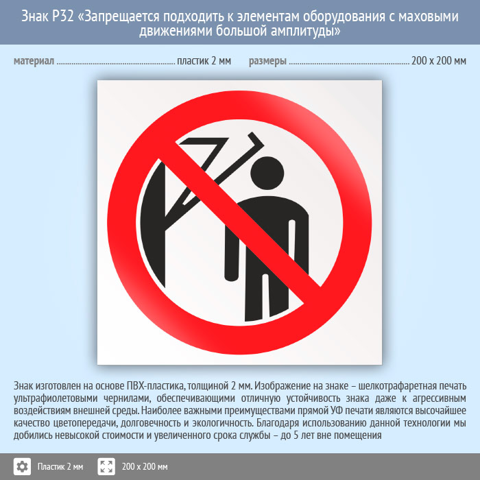 Знак P32 «Запрещается подходить к элементам оборудования с маховыми движениями большой амплитуды» (пластик, 200х200 мм) в Кашире купить