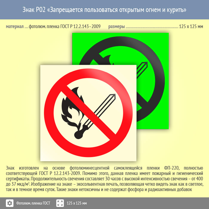Знак P02 «Запрещается пользоваться открытым огнем и курить» (фотолюминесцентная пленка ГОСТ 34428-2018, 125х125 мм) в Кашире купить