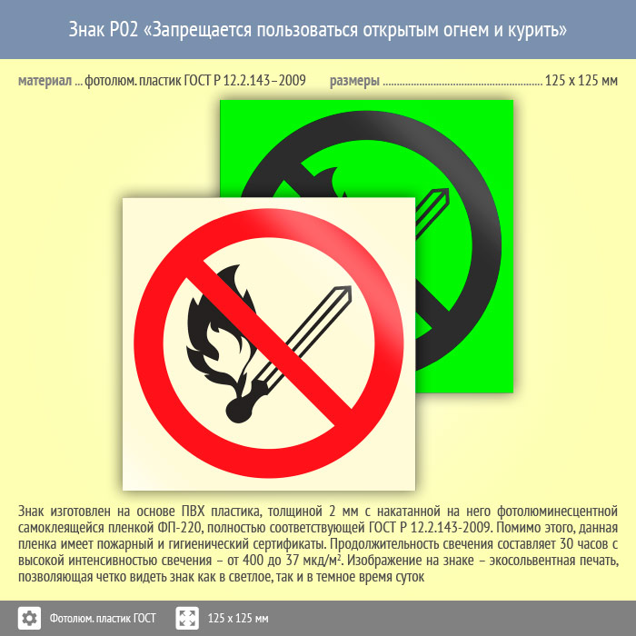 Знак P02 «Запрещается пользоваться открытым огнем и курить» (фотолюминесцентный пластик ГОСТ 34428-2018, 125х125 мм) в Кашире купить