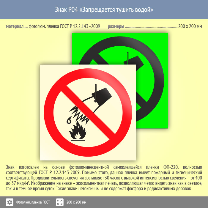 Знак P04 «Запрещается тушить водой» (фотолюминесцентная пленка ГОСТ 34428-2018, 200х200 мм) в Кашире купить