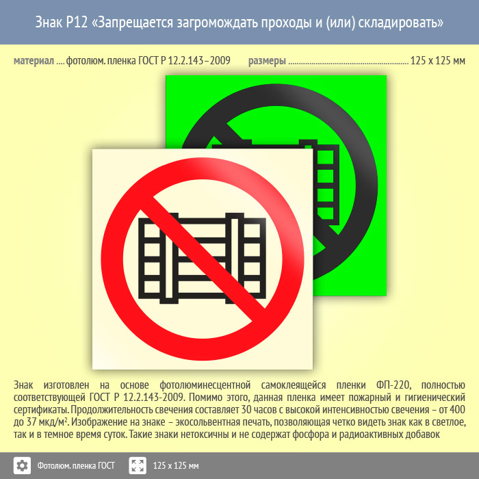 Знак P12 «Запрещается загромождать проходы и (или) складировать» (фотолюминесцентная пленка ГОСТ 34428-2018, 125х125 мм) в Кашире купить