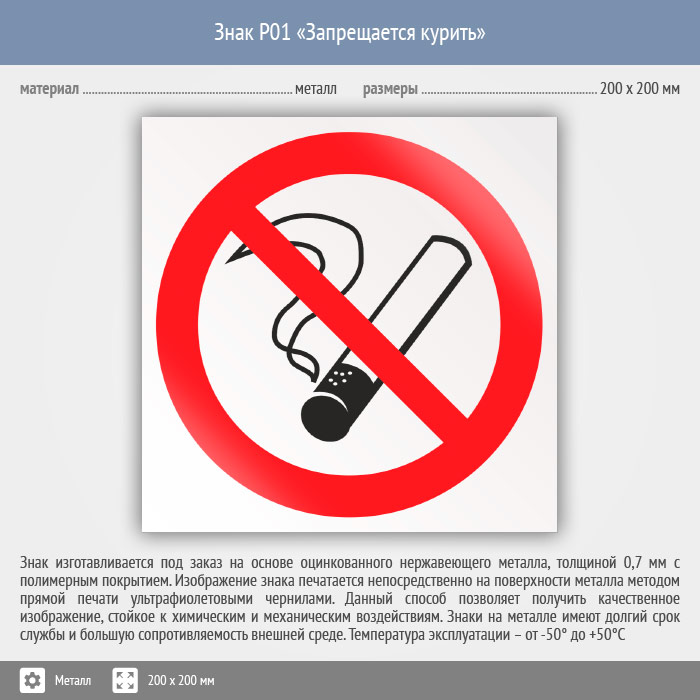 Знак P01 «Запрещается курить» (металл, 200х200 мм) в Кашире купить