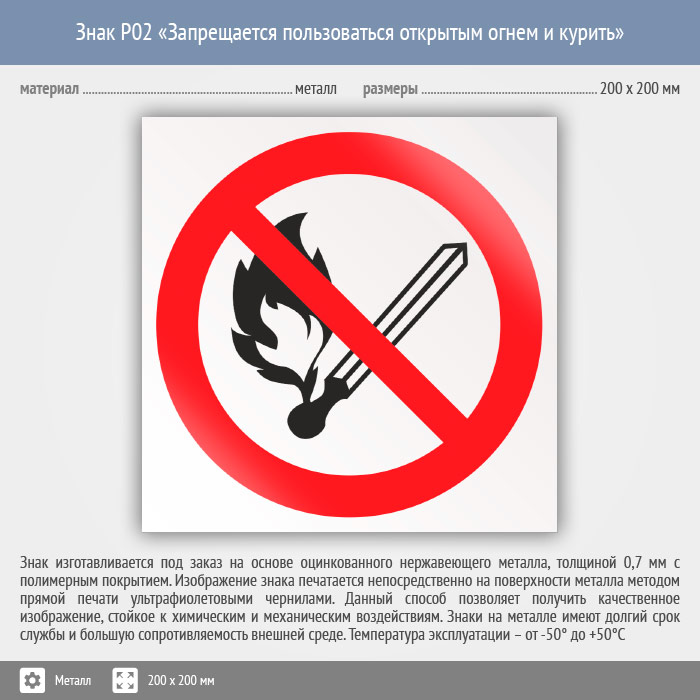 Знак P02 «Запрещается пользоваться открытым огнем и курить» (металл, 200х200 мм) в Кашире купить